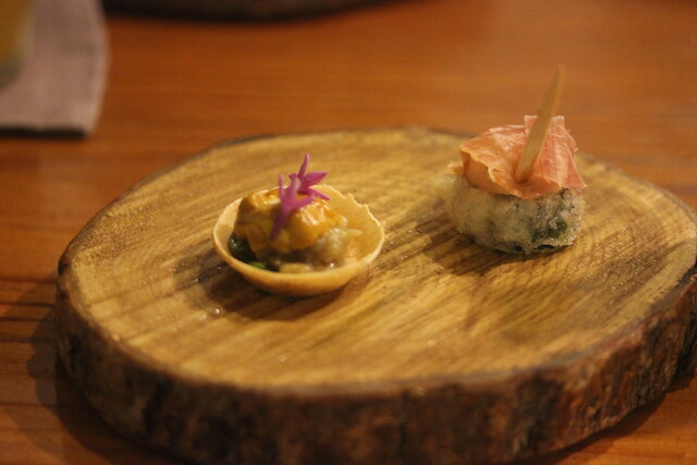 ズッキーニのフリットには鳥取産の甘エビと生ハムがのっかっています。