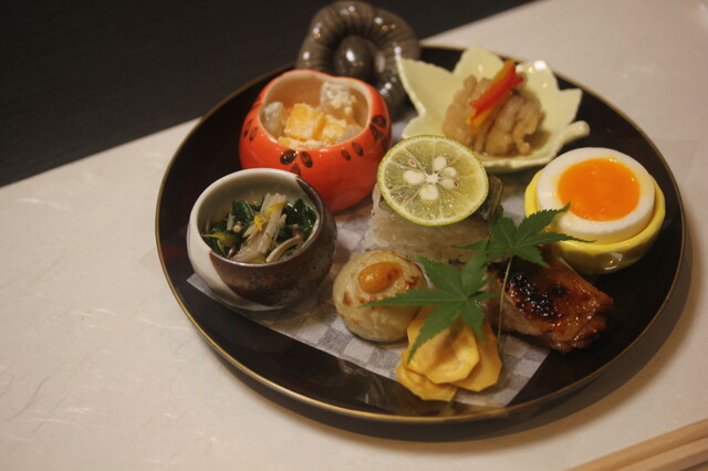 先付けがすぐに運ばれてきました。内容は柿とこんにゃくとニンジンの白和え、焼ききのこと春菊と菊のお浸し、初物さんま寿司、新物の里芋の田楽、栗煎餅、長州鶏の幽庵焼き、お月見のたまご、鱧南蛮漬けです。