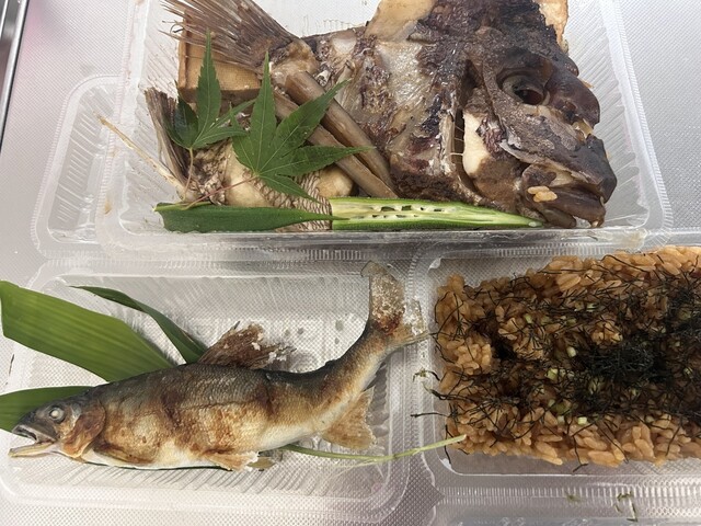 茶碗蒸し、タコのうま煮、もずく酢、鮎の塩焼き、鯛のアラ煮つけ、ハモ炊き込みご飯、お汁、アイス