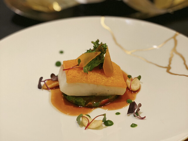 カラスミのクルートを纏ったマナガツオ マスタードを合わせた菜の花とジュドポワソンを添えて