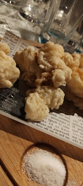 いただいたのはもちろんのたち天と、ゴボウスティック、牡蠣のアヒージョ、ぽんぽんにふくらんだクワトロフォルマッジ、鯖サラダ、そしてタパス3種盛り合わせ。