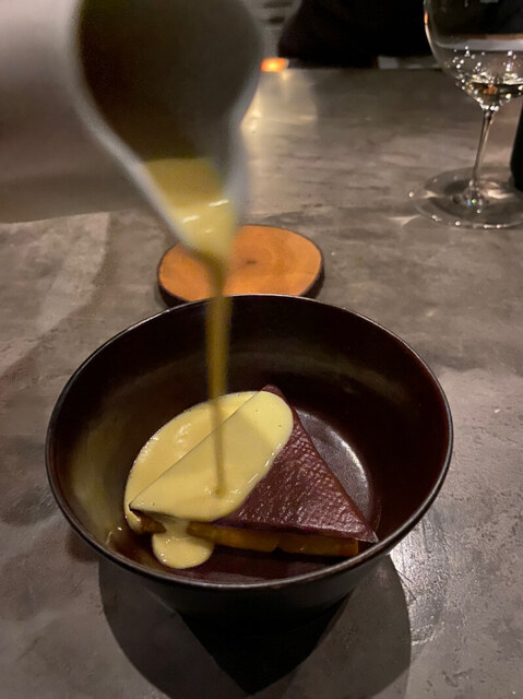 広尾にあるフレンチ ode(オード)でディナーを楽しんできましたぁ。 寒空の中踊り場でオープンするまで待機カウンター席と個室があるみたい。 コの字カウンターがメインでリピーターのお友達が言うには正面の席は特等席らしい。やった!!!正面のお席に通されました。ドリンクリスト店内が暗くて(汗)字が読めない。ペアリングは9000円だったかな。シャンパンはグラスで3種類ありオール2000円白ワインはグラスで4種類で1400円~2200円 ◆HuiaDryRiesling1400円辛口リースリングでほんのり酸味もあって華やかな香りで飲みやすい~。お食事スタート最初にブラックオレンジリキュールが出てきたので外人スタッフさんの説明を良く聞いてなく(汗)料理が来る前に飲み干してしまった。(爆)どうやらアミューズの後に飲むみたい。これが噂のドラ〇ンボール~。フタをあけて!!!煙モクモク~。◆ ドラ〇ンボールオマール海老のムース一口で食べると殻が割れオマール海老のビスクがジュワーっと!!!口の中にオマール海老の余韻が残る状態で先ほどのオレンジリキュールを流し込むのだけどこれが抜群に美味しい~。ちなみにリキュールはさりげなくお替りくれました。あはは。 ケールタルト深みを感じる~。サワークリームがアクセント ビーツブラックオリーブ甘しょっぱさな味お箸も出てきます~。持ち帰りもできるのでエコね。シグネチャーのグレー お店のテーマカラーはグレーだそうです。◆ グレー2020メレンゲの中にはイワシの頭やアボカドなど見た目以上に美味しい。 ◆自家製フォカッチャあまりにも美味しくて何回もお替りしたら最後お腹が一杯で苦しかったー。焼き立てモチモチ~。 目の前でカリフワラーのムースをエスプーマ仕立てで最後の仕上げ 香箱カニ カリフラワープラス料金で白トリュフにも~。カリフラワーの食感がいい。セコカ蟹は小さいけど身もしっかりで濃厚なカニミソにプチプチのタマゴこれが出てくるだけでも嬉しい~。 熟成カボチャ ブータンノワール ラベンダーこの三角!!!目の前でソースかけブータンノワールがミルフィーユ状になって全くクセもなく食べやすい~。カボチャの甘さが引き立つ!!!次に出てくるブリ~。赤ワインにチェンジ!!! ◆Xinomavro赤ワインはあまり飲まないから良くわからず適当に頼んだけど渋みはないけど酸っぱい!!!調べるとギリシャのクシノマヴロの品種らしい。お替りフォカッチャと一緒にぃ。 ◆ブリ トレビス 黒酢脂が乗ったブリ黒酢がかなりきいて酸味のある赤ワインが更にプラスされるー(笑)◆ 山形牛 りんご 堀川ごぼう本当は鴨なんだけど最近苦手で・・牛肉になりました。炭火で仕上げたのだそう。ソースはリンゴペースト系なので甘い目京都の堀川ゴボウ風味が良くて繊維が柔らかい~。 ◆うらわせみかん 酒カスフロマージュ仕立て食後の紅茶は6種類からチョイス◆栗ローズマリー ほうじ茶大きな栗は渋皮煮煮てから揚げると言うかなり手の込んだ一品ホクホク~。 シガールシガーボックスに入って登場~。湿度計もしっかりあって本格的。手前2本しか食べられませんよ~と(笑)紅茶風味だったかな。グルテンフリーのバナナタルトやいちじく紅茶は和紅茶ゴッホのひまわりに見立てたキウィフルーツと食べられるお花のエディブルフラワーの組み合わせと言う何とも斬新なプティーフルール食べるのは一瞬だけどかなり手が込んでいるー。 パティシエさんがピンセットで一枚一枚花びらをつけてました。細かい作業だわ。最後のデザートまで楽しませてくれてもう感動しっぱなし~。最後に直筆サイン入りのメニューが渡されて終了~。話には聞いていた通り本当に美味しくて大大大満足 そんなにお安くないのに(苦笑)来ている客層は若い方ばかりの30代個室は女子会でカウンター席はカップル連れ皆ペアリングのコースを頼んでる~。(汗) キッチンの中にいるスタッフさんも予想以上に多くて活気があって勢いがあるお店は違うなぁ。と。 また感動料理を食べに訪問したい(*^^*)