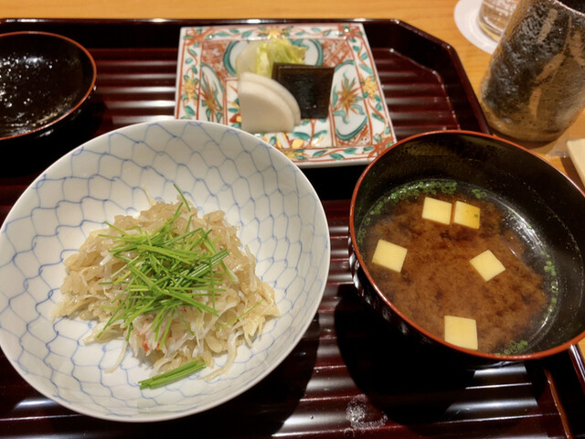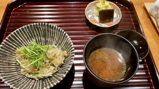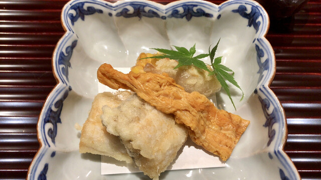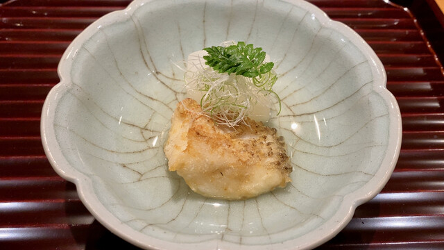 ・目抜けと聖護院大根:主役の目抜けが美味しいのはもちろん、上にあしらわれたねぎの細さはどうでしょう。なんでも、わざわざ1枚ずつ向いた白ねぎを、包丁でさらに半分の薄さにスライスした上で千切りにしているそうです。これだけ細くすることで、ねぎの余計な食感や刺激が素材の味を邪魔することなしに淡い爽やかさだけが加わっています。素材の良さを生かすために、ここまで気を使うのですね。
