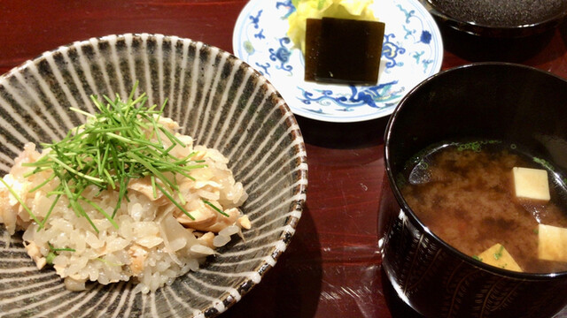 筍御飯には、米の食感との釣合いを考えて、姫皮と薄くスライスした穂先の柔らかい部分のみを使う。一緒に炊かれた実山椒の香りと刺激と筍の風味との調和も絶妙。