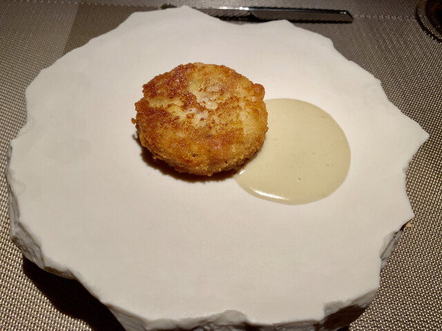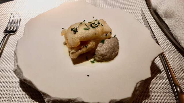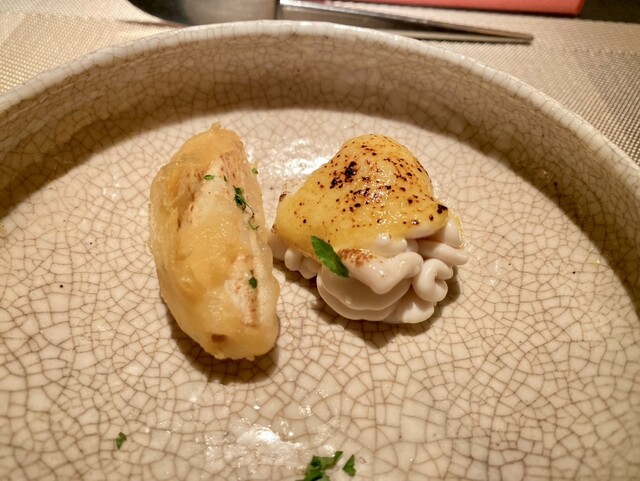白魚と玉葱のフリット 蛍烏賊のソース