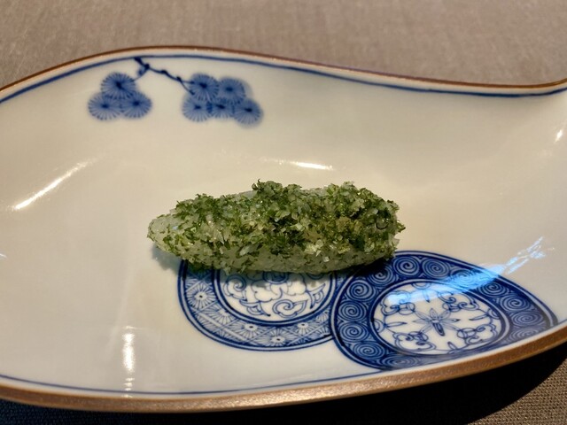 丈蛤春巻:ふっくらした蛤真丈と蕗の薹の苦味が春を感じさせる