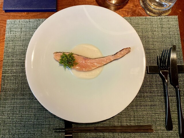 桜ますの藁焼き 米と中国甘酒のソース 花山椒
