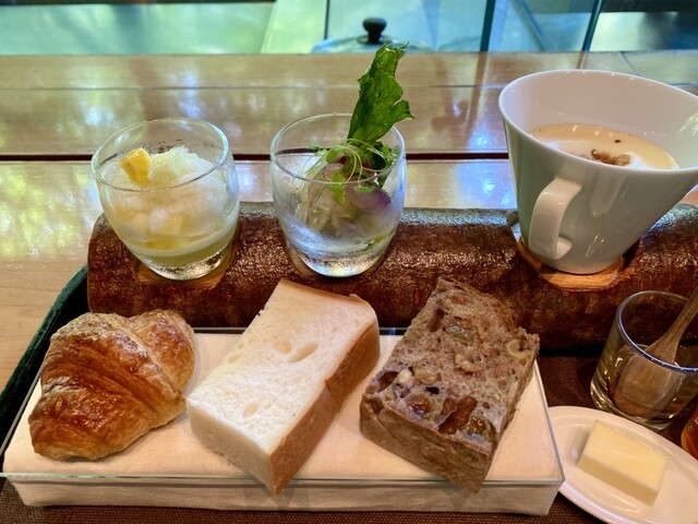 朝食 メロンとパインのヴェリーヌ 地魚のセビーチェ クロワッサン パンドミ くるみ