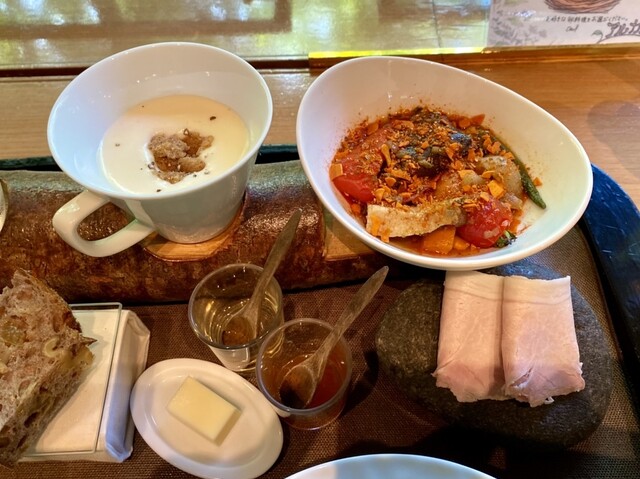 朝食 じゃがいものエスプーマ・伊豆牛の煮込み 季節野菜のスパイスマリネ 自家製生ハム