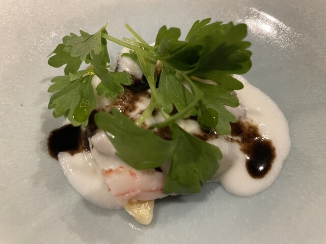 蛤/ 竜鬚菜(ホワイトアスパラガス) 琵琶(びわ)甘エビ、キャビア セロリとアスパラのクリーム