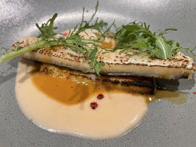 そして、続いての冷製で甘目のベリー系ソースを絡めたカンパチにはオレンジワイン、温かいソースのレンコンには濁り酒、とキレイなお皿・素敵な味わいに絶妙なペアリングが続く。