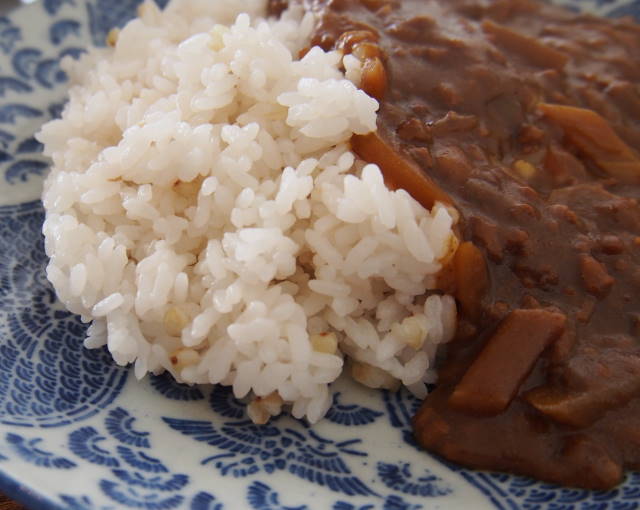 頼んだのは外の黒板を見て気になっていた「山ウドのカレー蕎麦の実ごはん」