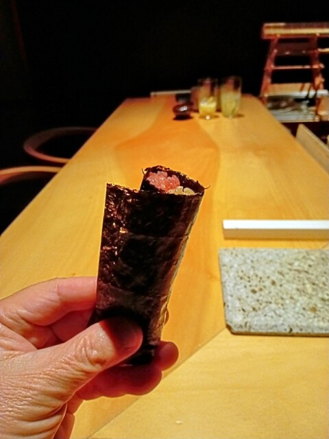 ・トロ漬け手巻き…まずは有明産のパリパリの海苔で巻かれたトロの漬けたたきの極細手巻きを手渡しで。