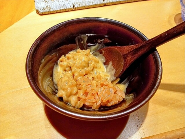 ・あわび肝ソースリゾット…残った肝ソースにシャリ玉を入れて作ります。