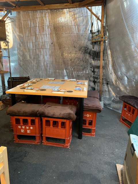 なるほど、カウンターのみのお店の前に仮設の骨組み造ってテーブル設置してビニシーぐるりと囲ったスペース。