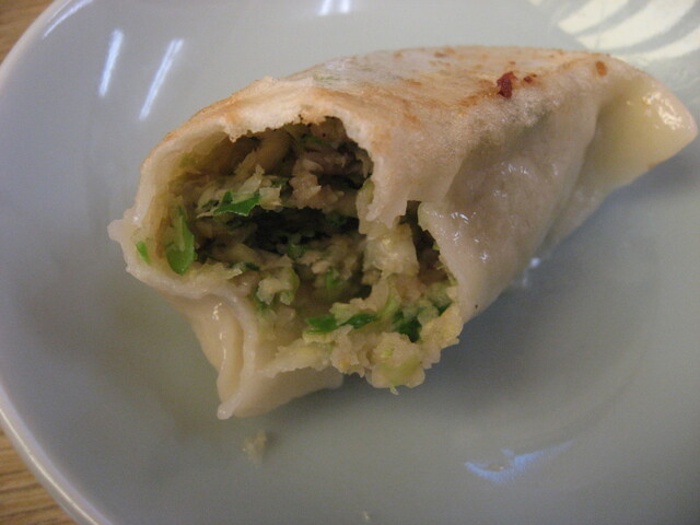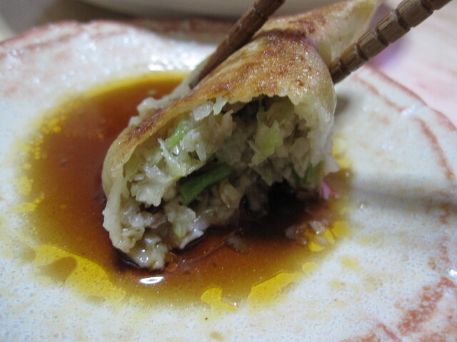 ザク切りされたキャベツやニラが中心の餡テで、チョッピリ「にんにく」が効いており、