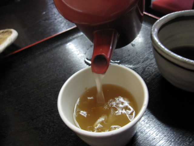 猪口には少量の汁、薬味は入れずに、湯桶からゆっくりと蕎麦湯を注ぎ入れ、