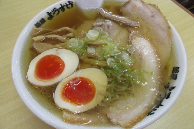 薄~い琥珀色した、透明感溢れるスープに浮ぶ脂玉は、ほぼ皆無。