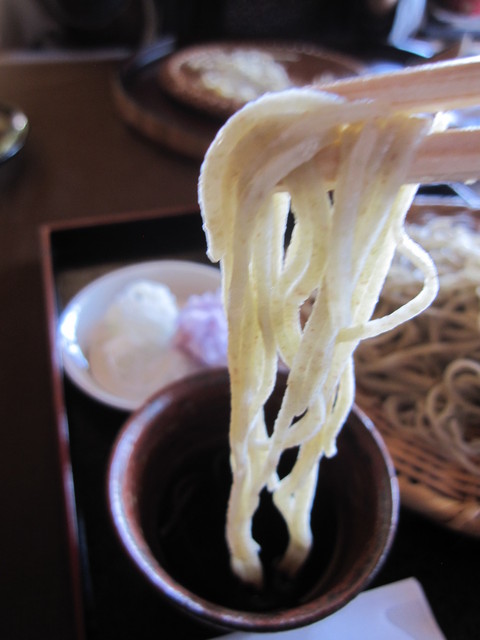 やや鶯色した蕎麦は粗めの粒子で打たれ、ピンクや緑の甘皮も確認出来、