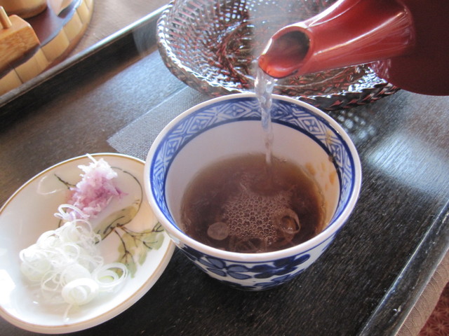 途中で提供された湯桶に入った「そば湯」も透明に近いサッパリタイプ。