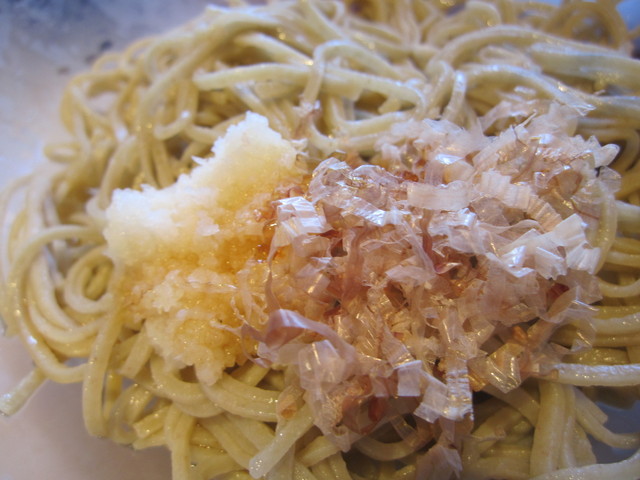 薬味皿には「揉み海苔」、「辛味大根」、そして「花かつお」・・・と「ねぎ」。