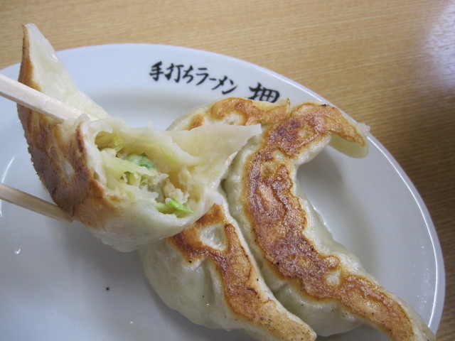 カリカリの焼き目が付いたデッカい餃子は熱々で、優しい味付け・・・。