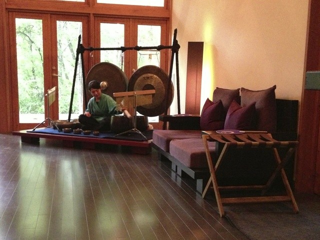 部屋の方ですが、まず中庭が見渡せるソファー付きの前室があり、奥に和室。和室にはシンプルで美しい床の間と、一角に堀床式カウンターの書院があります。 そして水回り。洗面所・浴室もとても工夫されており、浴室は中庭から日が射す造りとなっていて、とても気もち良いです。トイレスペースも横幅をひろめにとってあって、普段トイレで感じる圧迫感がなくとても広く感じます。