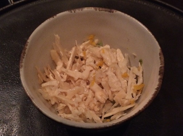 蓮・牛蒡・くわい・百合根・むかご等の根菜類を、発酵卵黄とピーナツのソースと横に添えられた生姜と共に頂きます。