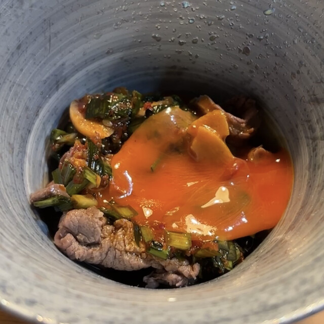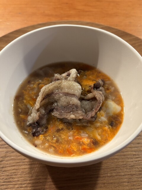 鴨と熊の骨髄の雑炊:熊のあばら肉 柚子ポン酢 鹿のキムチ