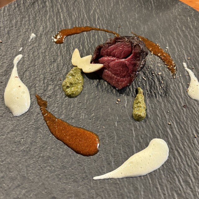 鹿外腿肉 苺のソース 削りたてペコリーノロマーノチーズと共に