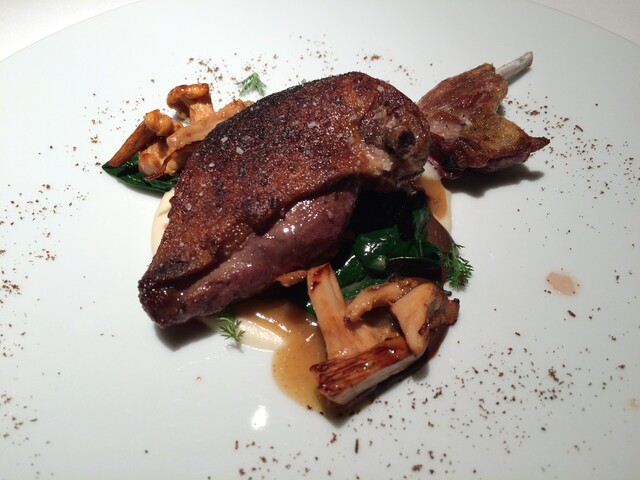 炎〜フランス・ヴァンデ産仔鳩の薪ロティとその内蔵のジュ、根セロリのピュレ、法蓮草とジロール茸、のこぎり草と野生の胡椒