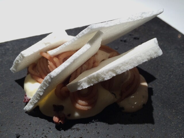熟成和栗のクリームと竹炭プララン、ブールノワゼットのアイスクリーム、黒オリーブ、タカラ牧場の「小さなトム」のムース