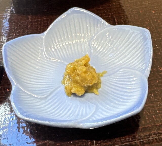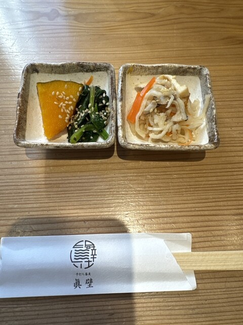 じつはこの店地酒の提供もあって混んでいて順番譲って待っていたらお通しをサービスでいただきました。薄味で美味しいカボチャの煮物とおひたしでした。わざわざ有給取って昼酒飲みに蕎麦をつまみにいらっしゃる方もいると伺い納得でした。