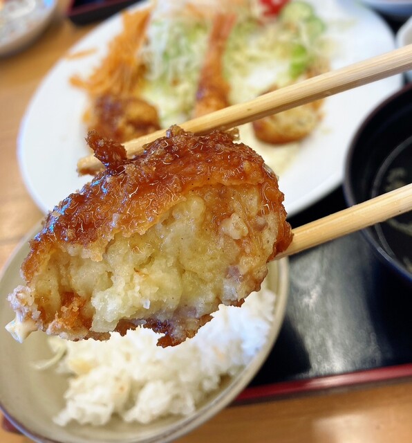 大きく分厚い豚ヒレカツ。エビフライ。まさに手作りじゃがいもパンパンのコロッケ。