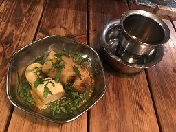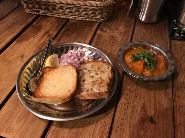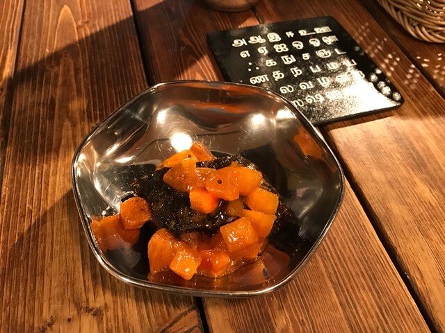 ビールを飲みながら先ずはStarterの「アンプルディヤル」を頂きます。魚のスパイス煮込みでありまして、富有柿のピックル=漬物と合わせて、ビールのおつまみにぴったりでございます♪