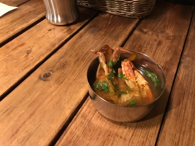 本日のスターターはもうひとカトリありまして、蟹のラッサム「カックラー・トク・ジョール」が供されます。酸っぱ辛いスープでありまして、先週は辛過ぎるとして食べられないお客さんが続出したそうですが、これは結構いけました♪
