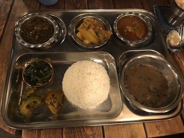 ショルシェ・マーチの魚が「鯵」、じゃが芋との皿が「鯖」、ムングダールとの組み合わせは鯛とか鱈とかのアラを使ってフィッシュヘッドの味わいを出しておられまして、日本の魚を使っているんだ… ルイとかのバングラの魚じゃないんだ… と却って新鮮に思ったものでしたが、この辺がバングラディシュ人が作る料理との違いとなって来るのでありましょう。