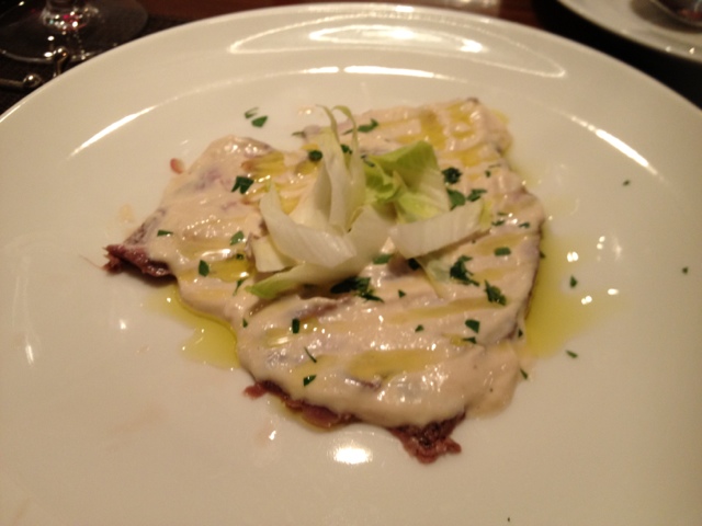 チョイと食べ足りないなぁと思って、「子牛のノンネットソース」をハーフでお願い出来るか?と聞いてみたりすると、嫌な顔一つせず、快く受けてくれるのでありました。ソースが上に乗って折角の赤みの肉がビジュアル的に出て来ないのが勿体無い、限りなく生肉に近いお肉の冷菜なんでございます。