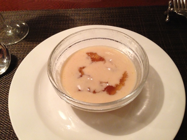 スプマンテで喉を潤しておりますと、「桃のスープ」がアミューズとして出て参ります。
