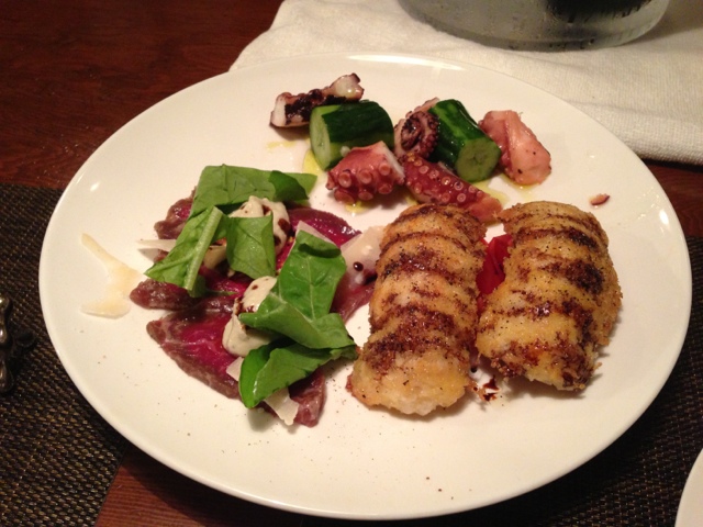 前菜の盛合せには、「穴子のパン粉焼き」「和牛のカルパッチョ、ナスとリコッタのピューレを添えて」「叩いたキュウリのマリネと茹でたタコのサラダ」の盛合せでありまして、まるで我々の心を読まれてでもいるかの様に、単品でお願いしたかった品が盛り込まれておりました♪