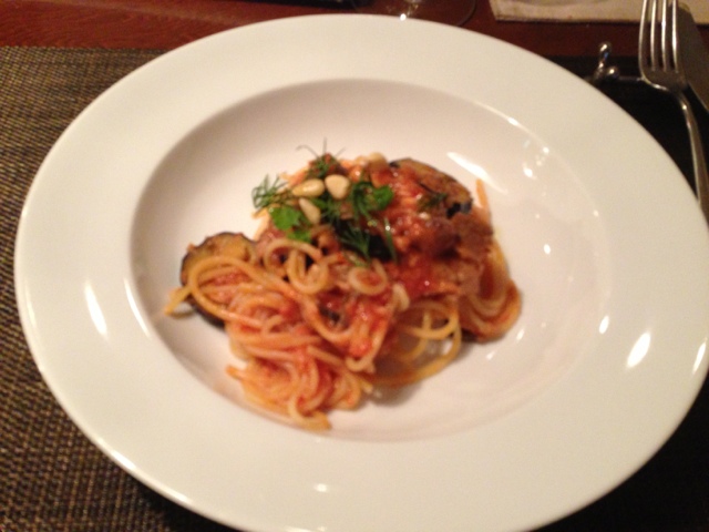 パスタは「白イカのタリオリーニ、スダチをそえて」なんかが爽やかで良さげでしたが、嫁がスパゲッティが良いと言う事でありまして(^^)「鰯とナスのシチリア風トマトソースのスパゲッティ」と致しました♪