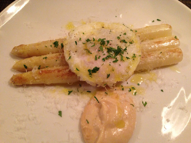 白ワインを舐めながらメニューを眺めておりますと「ホワイトアスパラと半熟卵のサラダ仕立て」が目に飛び込んで参ります。聞けばチリ産のホワイトアスパラと言う事で、先週末なんかは来店客の7-8割がご発注と言う事でございます。春の息吹が感じられる昨今ですもんね。