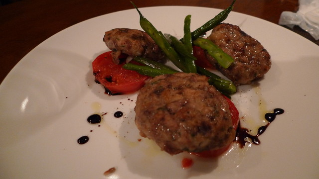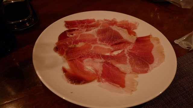 先ずは生ハムの「クラテッロ」。お値段が張るのでけち臭くハーフポーション (^^ゞ。肉の熟成感が好きな娘に大好評でございます♪ 続いてパテの類の2連発。「テスティーナ・デイ・マイアーレ」と言う豚の顔の部位で作ったゼリー寄せがこれまた大好評でありまして、写真を撮るのを忘れてぱくついてしまいました。