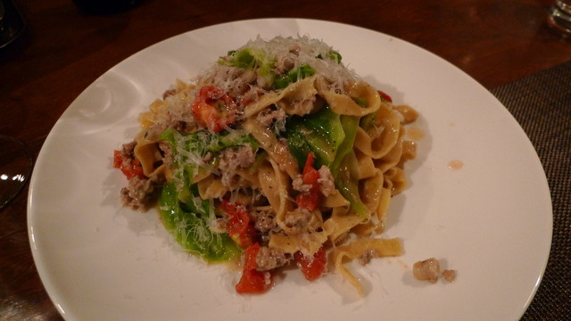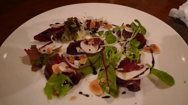 何時もの通り、前菜盛合せ×1品、パスタ×1品、メイン×1品をお願い致しまして、それを二人でシェアすると言う食べ方でございます。