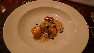 カルパッチョなんてありふれたメニューではありますが、これにナスとリコッタのピューレが添えられる事で、一味変わった風合いが出るものでありまして、この辺が福間シェフの技と申しましょうか、サービス精神の発露でございます。