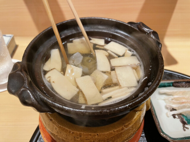 ミニ七輪に鱧の骨の出汁の松茸入りの小鍋をのせて。2枚落としの鱧を自分でしゃぶしゃぶします。5秒くらい経つと綺麗に花が咲いて食べ頃に。松茸と鱧の共演ってなんて贅沢♡
