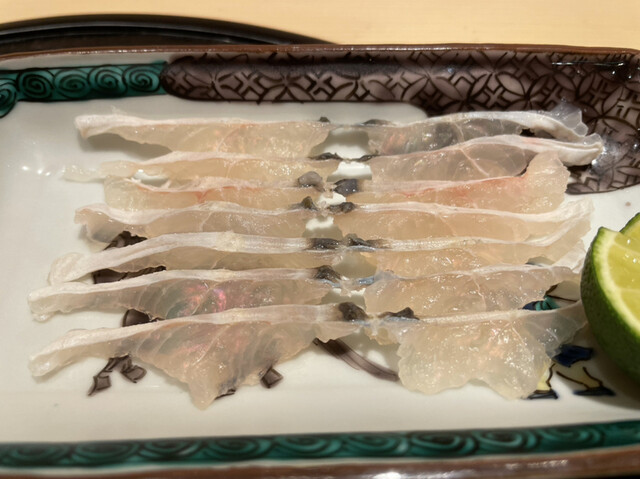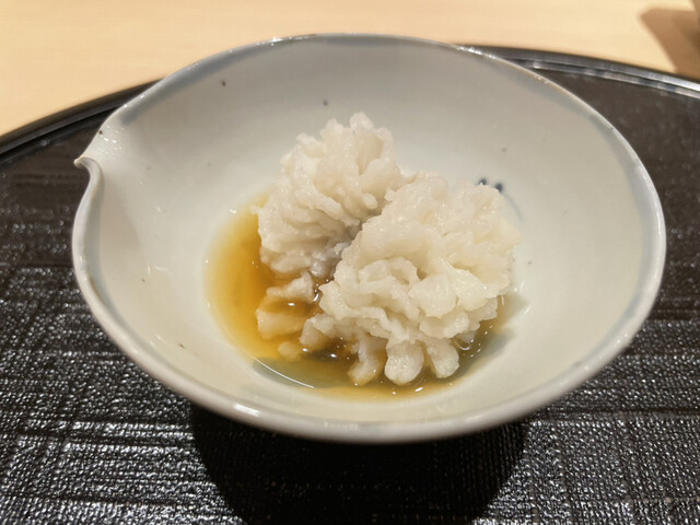 9回骨切りした9枚落としを湯引きで。2枚落としよりふぉわふぉわで身の美味しさを楽しめます。さっぱりしたポン酢で。