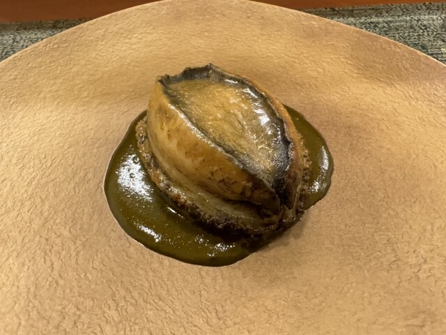 鮑の出汁だけでつくった東京ではやらない肝ソースを合わせて。この鮑はヤバっ。やわらかくてむっちり。旨みがやわかく肝ソースも絶品。