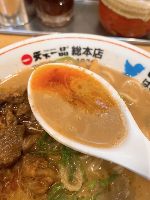 【2023年06月】牛すじラーメン(総本店限定)@1,300円、普通麺、ニンニク有り、スープ増量@110円、合計@1,410円、牛すじのそばのスープもイイ感じ♪