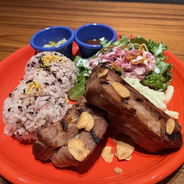 ハワイには何度か行ったことがありますが、このカフェは現地のアーティストの作品を取り入れていて、まるでハワイにいるかのような雰囲気を楽しめました。ガーリックシュリンプはニンニクがガツンと効いていて、パンチのある味わい。スペアリブのグリルはしっかりマリネされていて、お肉はとても柔らかく、甘辛で香ばしい仕上がりでした。コブサラダも具だくさんで大満足です。ドリンクには自家製レモネードをチョイス!見た目も可愛らしく、さっぱりして料理との相性もバッチリでした。